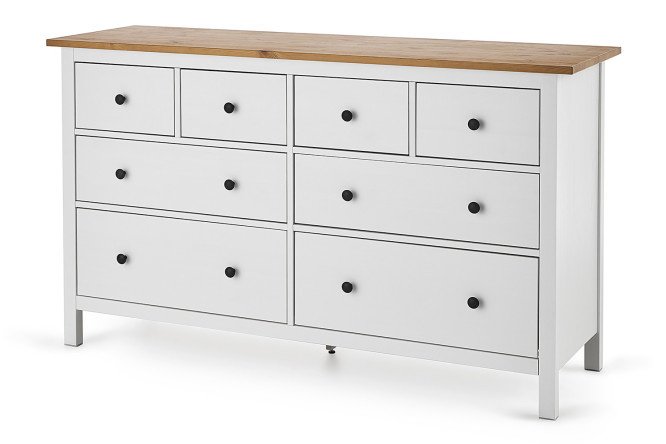 The chest of drawers has eight drawers on roller guides, which are not painted white on the inside like the fronts of the chest of drawers, which gives them a natural look.