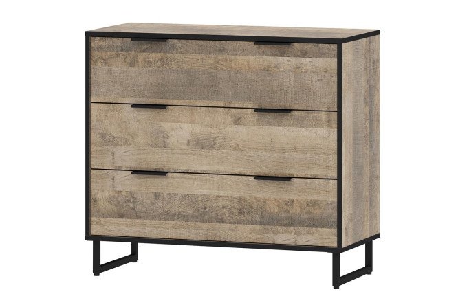 The Folk chest of drawers with a spectacular wood finish will become an organic element of a loft, a room in an industrial style and, together with other products from the collection, will allow you to decorate a stylish interior. The warm tone and original grunge sand oak pattern are emphasized by the black elements of the body, handles and frame-shaped supports.