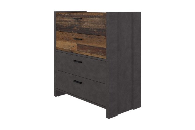 The Kristoff chest of drawers is a convenient and spacious storage system with an original design. Suitable for any living space in a modern style. The impressive look of the furniture is given by the combination of different colored coatings in the finishing of the frame and facades, as well as the unusual design of the side walls. The deep drawers have enough space for small items of clothing, accessories, educational supplies and other things. Ease and comfort when opening and closing are provided by ball guides and handles. The color of the fittings is in harmony with the side walls and the strip separating the two upper and two lower drawers.