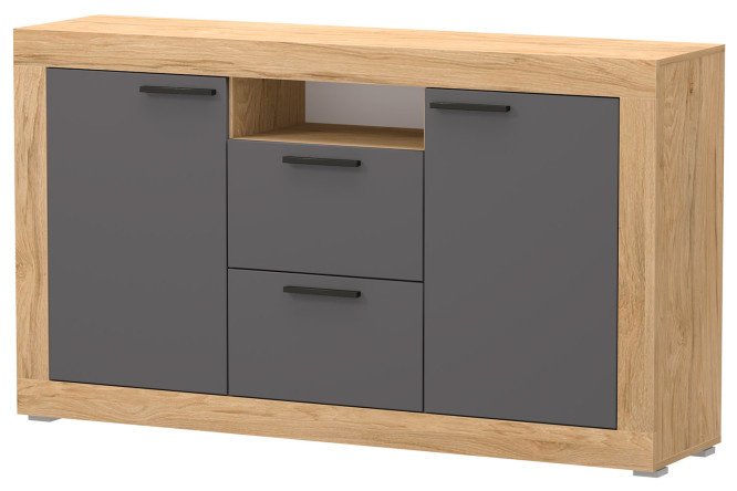 The Martin chest of drawers will allow you to pay tribute to a rational approach to organizing storage in the living room. The central part of the module is occupied by drawers and an open niche – it is convenient to place a media player, game console, and various components of a home theater system here. Each of the two side sections has one shelf – they can be filled with table linens, dishes, books, and a collection of CDs. When installing a TV or decorative aquarium on the lid, it is worth considering that it is designed for a total load of up to 10 kg.