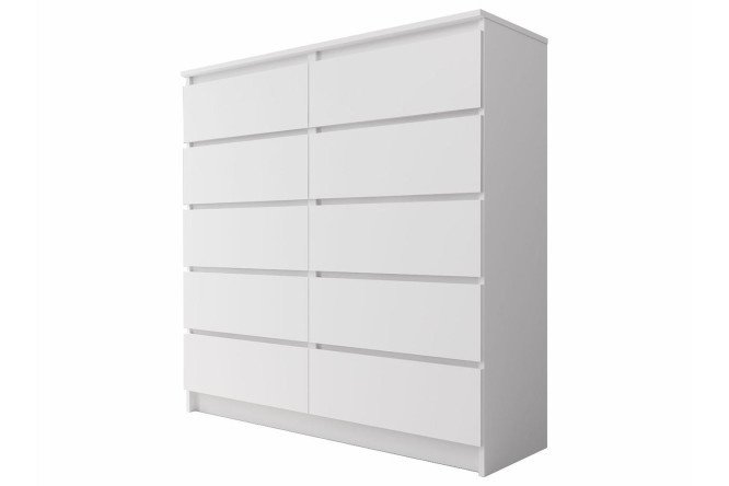 The minimalist style chest of drawers from the Mori MK1200.10 collection with 10 drawers will fit into any interior, adding style and comfort. The body and facades are made of laminated chipboard. Roller guides are used to pull out the drawers. The chest of drawers is divided into two sections by partitions, each section has 5 drawers – this allows you to sort things in more detail. There are no handles on the drawer fronts. The handles are the facades themselves, between which there are special spaces for ease of opening.
