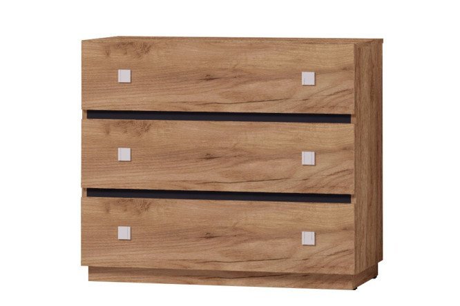 Laconic form with a bright, recognizable design is the main feature of the Neo chest of drawers. The model is made of laminated chipboard in the color “tobacco oak”; the dark veins of the pattern are in beautiful harmony with the narrow black inserts located between the drawers. The rectangular base is slightly recessed under the bottom of the chest of drawers, making the furniture look light and “slender”. It is impossible for clothes to catch on the galvanized metal handles: in the non-working position they hardly protrude above the plane of the facade, and when you need to roll out the drawer, the middle part is grabbed from the bottom up and acts as a lever. The chest of drawers was designed for the Neo modular bedroom, but it also looks good as part of other modern style sets.