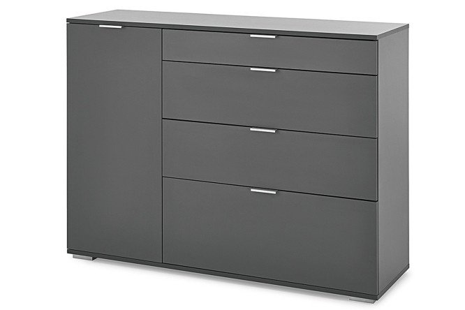 Chest of drawers NK 3 will become a harmonious element of a living room furnished in a modern style. The main structural elements are made of laminated chipboard with a matte surface that imitates wood with a pronounced textured pattern. For storing things there are 4 drawers of different sizes, as well as a side section with shelves and a hinged door. The facades are equipped with overhead furniture handles. The maximum load per drawer is 3 kg, the shelves can support up to 5 kg. The laminated surface does not require complex care; it is recommended to wipe it with a soft, dry cloth and a special furniture cleaner.