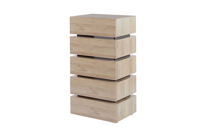 The Oslo chest of drawers is ideal for storing things and maintaining order in the living room, creating additional space for relaxation and communication. The model is equipped with five drawers, which allows you to find space for tablecloths and napkins, cutlery and accessories. Drawers without front fittings open over an overhang; full extension guides make their contents easily accessible. The black connecting strips contrast impressively with the wood texture of the fronts and body.