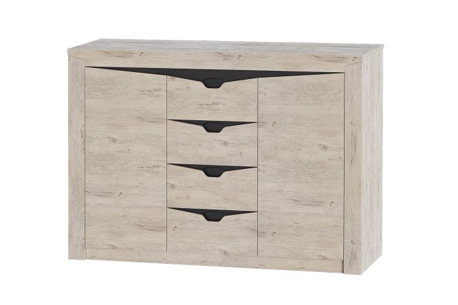 The Sorento chest of drawers will prove its necessity in any room where an additional storage system is needed: in the bedroom it can be used for bed linen, in the living room – for dishes and table linens. The central part of the module is occupied by 4 drawers on ball guides, with closed sections on both sides of them. Each compartment has one shelf. The design is dictated by the fashion trend – there are no handles on the facades: the drawers are pulled out behind a decorative recess, the doors are equipped with an automatic push-out system.