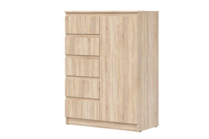 On the right side of the chest of drawers there are three deep shelves, which are closed with a blind hinged door. The left section consists of five spacious drawers. They are equipped with roller guides that ensure silent and smooth movement.