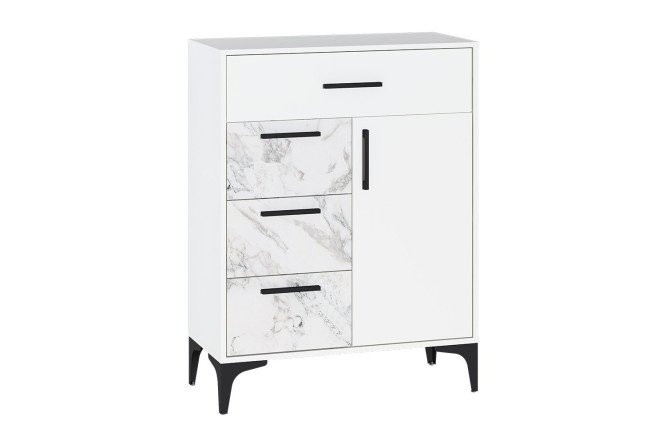 The Trento chest of drawers will become a bright decoration in the hallway, living room, bedroom or home office. The design of the model uses coatings of different shades: “marble” surfaces are organically combined with white facades, and black handles and curly legs complete the stylish look.