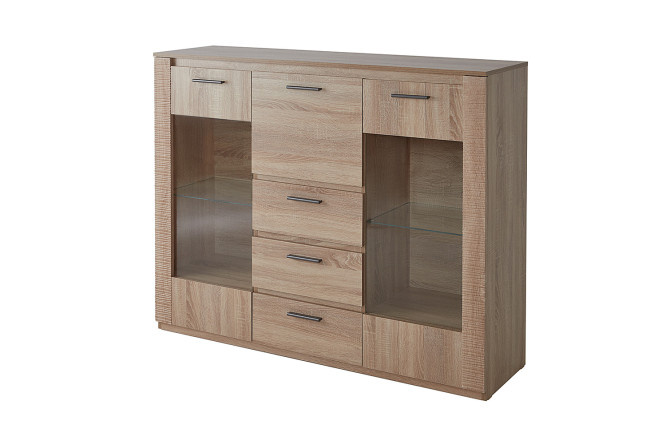 Chest of drawers with bar Elana made of laminated chipboard, MDF, glass in the color “Sonoma oak, light matte Sonoma oak”.