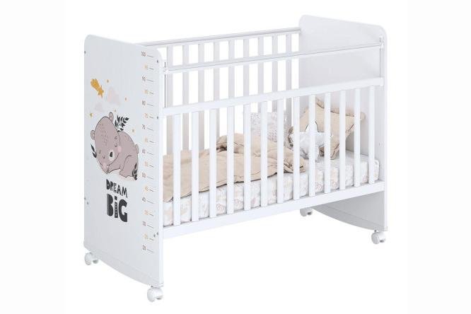 The slatted base of the model provides natural ventilation of the mattress and promotes the correct formation of the baby’s spine. The bed can be set in 3 height positions: 50 cm (0-3 months), 40 cm (3-6 months), 30 cm (6-36 months). Data includes wheels. Thanks to the removable front side, it can be attached to the parent’s bed, which allows the baby to be closer to the mother, facilitating the process of care and feeding during the night. To secure the product to the parent’s bed, the kit includes two fixing straps.