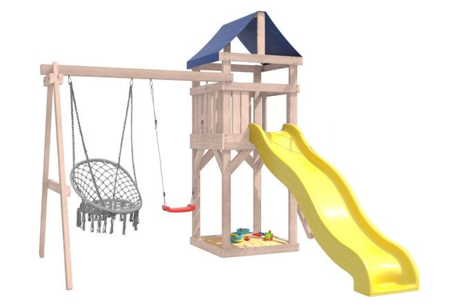 The IgroWoods playground is an excellent solution for children’s active recreation in the fresh air. It is a multifunctional gaming complex, which is made of high-quality and safe materials, which ensures the durability and reliability of the structure. The multifunctional sports play complex is designed for children from 3 to 14 years old. With the help of this playground, children will be able to develop their physical fitness, coordination and logical thinking. In addition, playing outdoors helps strengthen the immune system and improve the overall health of children. Outdoor hanging garden swings are suitable for children and adults, as the swing beam can withstand a total weight of up to 250 kg. The platform is made from deciduous and coniferous timber. The material has a natural wood texture, treated with special compounds for longer use and protection from wood destruction. All elements are pre-polished, the edges of the products are rounded. A minimum of metal elements reduces the risk of injury. The site is placed on the ground (concreting is not necessary).