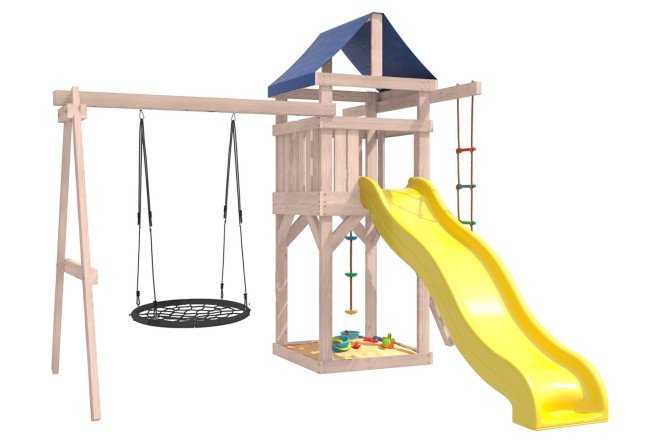 The IgroWoods playground is an excellent solution for children’s active recreation in the fresh air. It is a multifunctional gaming complex, which is made of high-quality and safe materials, which ensures the durability and reliability of the structure. The multifunctional sports play complex is designed for children from 3 to 14 years old. With the help of this playground, children will be able to develop their physical fitness, coordination and logical thinking. In addition, playing outdoors helps strengthen the immune system and improve the overall health of children. Outdoor hanging garden swings are suitable for children and adults, as the swing beam can withstand a total weight of up to 250 kg. The platform is made from deciduous and coniferous timber. The material has a natural wood texture, treated with special compounds for longer use and protection from wood destruction. All elements are pre-polished, the edges of the products are rounded. A minimum of metal elements reduces the risk of injury. The site is placed on the ground (concreting is not necessary).