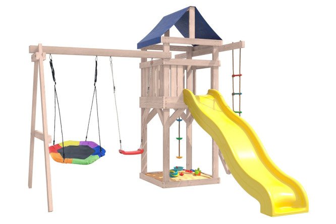The IgroWoods playground is an excellent solution for children’s active recreation in the fresh air. It is a multifunctional gaming complex, which is made of high-quality and safe materials, which ensures the durability and reliability of the structure. The multifunctional sports play complex is designed for children from 3 to 14 years old. With the help of this playground, children will be able to develop their physical fitness, coordination and logical thinking. In addition, playing outdoors helps strengthen the immune system and improve the overall health of children. Outdoor hanging garden swings are suitable for children and adults, as the swing beam can withstand a total weight of up to 250 kg. The platform is made from deciduous and coniferous timber. The material has a natural wood texture, treated with special compounds for longer use and protection from wood destruction. All elements are pre-polished, the edges of the products are rounded. A minimum of metal elements reduces the risk of injury. The site is placed on the ground (concreting is not necessary).