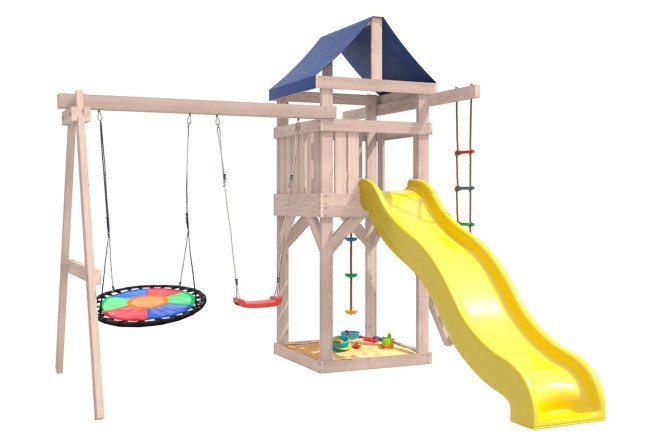 The IgroWoods playground is an excellent solution for children’s active recreation in the fresh air. It is a multifunctional gaming complex, which is made of high-quality and safe materials, which ensures the durability and reliability of the structure. The multifunctional sports play complex is designed for children from 3 to 14 years old. With the help of this playground, children will be able to develop their physical fitness, coordination and logical thinking. In addition, playing outdoors helps strengthen the immune system and improve the overall health of children. Outdoor hanging garden swings are suitable for children and adults, as the swing beam can withstand a total weight of up to 250 kg. The platform is made from deciduous and coniferous timber. The material has a natural wood texture, treated with special compounds for longer use and protection from wood destruction. All elements are pre-polished, the edges of the products are rounded. A minimum of metal elements reduces the risk of injury. The site is placed on the ground (concreting is not necessary).