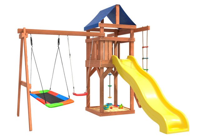 The IgroWoods playground is an excellent solution for children’s active recreation in the fresh air. It is a multifunctional gaming complex, which is made of high-quality and safe materials, which ensures the durability and reliability of the structure. The multifunctional sports play complex is designed for children from 3 to 14 years old. With the help of this playground, children will be able to develop their physical fitness, coordination and logical thinking. In addition, playing outdoors helps strengthen the immune system and improve the overall health of children. Outdoor hanging garden swings are suitable for children and adults, as the swing beam can withstand a total weight of up to 250 kg. The platform is made from deciduous and coniferous timber. The material has a natural wood texture, treated with special compounds for longer use and protection from wood destruction. All elements are pre-polished, the edges of the products are rounded. A minimum of metal elements reduces the risk of injury. The site is placed on the ground (concreting is not necessary).