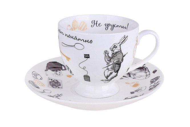 Coffee couple Crazy tea party is an original set for everyone who likes non-trivial design solutions. Dishes with motivating inscriptions and thematic drawings can be examined endlessly, each time finding new, previously unnoticed nuances. This set will make a wonderful gift.