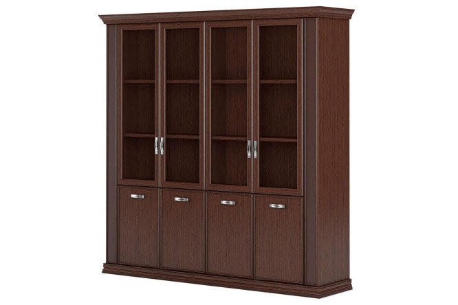 The classic Porto executive office is furniture that makes its owner happy every day. This model was designed by Italian designer Marco Bortolin. Furniture with figured borders, cornices and plinths is complemented with decorative leather inserts with crocodile embossing. These details emphasize the status of a confident, respectable and reliable owner. The PORTO cabinet is presented in exquisite colors – light oak, dark Rover cafe and noble classic walnut. The executive desk can be supplemented with a briefing, a side console, or one or two hanging cabinets. A large rack can be used either with a panel, where you can place a TV and put your favorite decorative items on glass shelves, or without a panel, as a low cabinet. The office looks equally good both in an office and as a home office, decorating the interior of a private house or cottage.