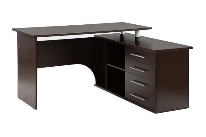 Computer corner desk KST-109 is a full-fledged workplace, a real home mini-office. Proper content of the model makes it possible to conveniently place everything you need for work in the access area. The durable tabletop can easily support the weight of a monitor and peripheral devices; there is room for office supplies in the drawers, and for folders with documents and books in the open niches. There is a high niche for the system unit. The design of the corner table is thought out to the smallest detail – there are no shelves under the main workplace, so if necessary you can stretch your legs without fear of touching something, and all storage places are located in the cabinet. The model is made in the universal color of wenge wood.