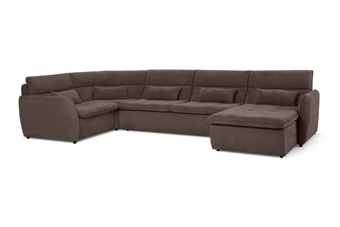 The corner sofa bed Riviera will decorate a spacious living room. The absence of armrests makes the model more spacious. The semicircular shape of the back, upholstery with interesting geometric stitching and comfortable decorative pillows give the sofa a special originality.
