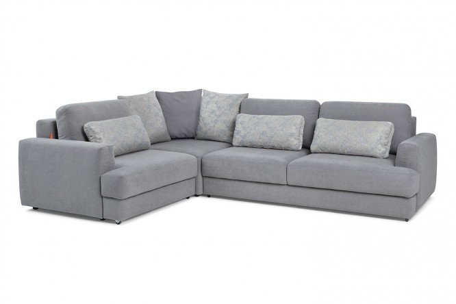 The stylish SOLANA Portland corner sofa bed in velor upholstery is a godsend for a large family. The model is ideal for both classic and modern interiors. Jacquard decorative pillows in gray-blue color make the sofa even more impressive.