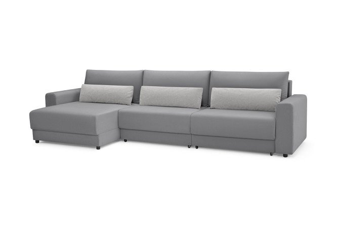 The corner sofa bed Town has a laconic design. Thanks to its minimalist design, the model will harmoniously fit into any modern living room. To decorate the sofa, elongated decorative pillows are used, decorated in a companion color.