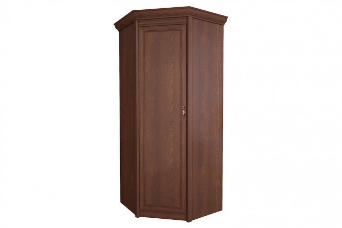 Corner wardrobe Florence is a good choice for the living room of a city apartment or a private house. This piece of furniture is also suitable for a small hallway. A wardrobe with a figured cornice, a hinged door and reliable fittings will look good in a classic interior along with other elements of the same collection. The presented model is made of durable chipboard panels with a coating that imitates the color and pattern of natural oak. This is an excellent option for connoisseurs of laconic, noble interior design.