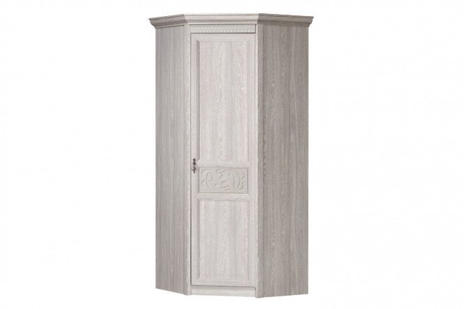 The design of the Lucia corner cabinet harmoniously coexists the idea of ​​functionalism and the careful use of neoclassical techniques. The model can fill the corner space of the bedroom or become part of a closet group in the dressing room. The interior space of the closet is designed for clothes of all types: hung on hangers and stored folded. There are 3 shelves for linen and knitwear; in the upper part there is a mezzanine shelf for hats. Decorative inserts and patinated overlays with milling are used in the decoration of the facades and cornices; elegant handles are made of metal in the shade of old gold.