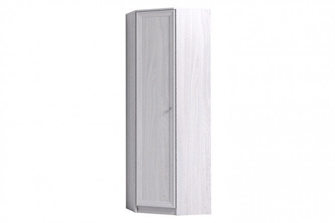 Corner wardrobe Paola is designed for storing clothes and bed linen. Thanks to its thoughtful design, it will take up minimal space in the room and help save useful space. The model is made of 16 mm thick laminated chipboard in a decorative film that skillfully reproduces the texture of natural wood; a gray shade with a cream undertone will make the room brighter and more comfortable. On the left, behind a blind hinged door, there is a wardrobe compartment with a stationary metal hanger bar and a convenient mezzanine shelf. On the right are five shelves, each of which can withstand a load of up to 6 kg.