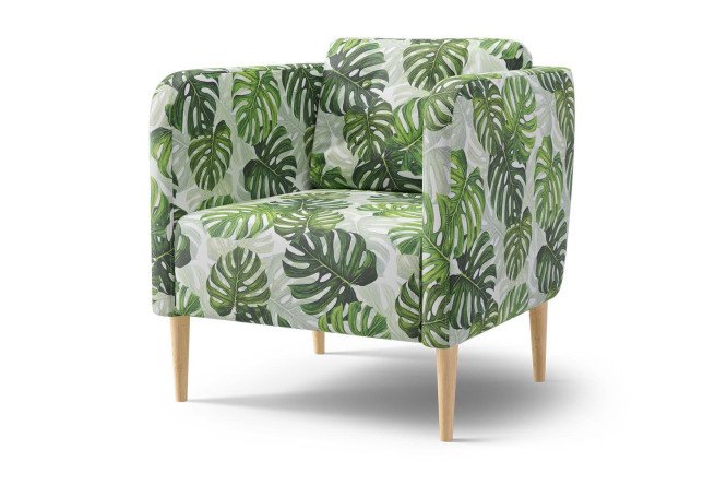The Corsi chair is a place to relax, made in the Scandinavian style. Its convenient design is emphasized by its elegant appearance. The upholstery material is velor, it is famous for its practicality, durability, moreover, it is pleasant to the touch and can be easily dry cleaned. The monstera print will add freshness to any room. The filler makes the chair elastic, which is necessary for relaxation. Soft armrests will allow you to sit in the chair with maximum comfort. Thanks to its geometry, this model is ideal for zoning space. The height of the wooden legs makes it easy to clean under the chair.