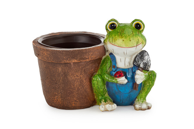 Decorative figurine of a Frog with a spatula and a flowerpot, 14.5 cm, Polyresin