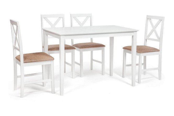 The stylish Hudson dining set will ideally complement the interior of the kitchen or dining room. The dining group will create an atmosphere of calm and comfort in the room. The frame of the table with a classic rectangular shape and the base of the chairs are made of solid hevea – strong and durable wood. The tabletop does not require special care and does not deform when temperature changes or from moisture. The soft fabric upholstery of the chairs does not change shape over time; it will delight you with its original appearance for many years. This set provides comfortable accommodation for four people. The furniture is supplied unassembled; simple assembly is required. Instructions included.
