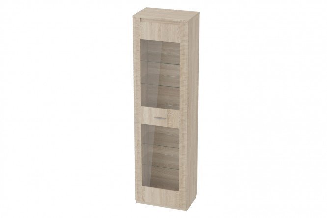 Thanks to its laconic design, Elana’s compact cabinet with showcase will ideally complement the interior of any room. The decorative finishing of the product consists of simulating compressed fabric on the surface of the facade. The drawer visually divides the structure in half, delimiting the glass closed shelves. In addition to its main purpose, this elegant antique curly handle also serves as a decoration. Light-colored MDF material combined with transparent glass looks light.