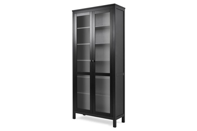 The Evans display cabinet is made of solid pine, painted black, while maintaining the visible structure of the wood. The legs are 11 cm high, making it easy to clean underneath. The display part of the cabinet consists of glass doors behind which you can place books, decorative elements such as vases, figurines or candles.