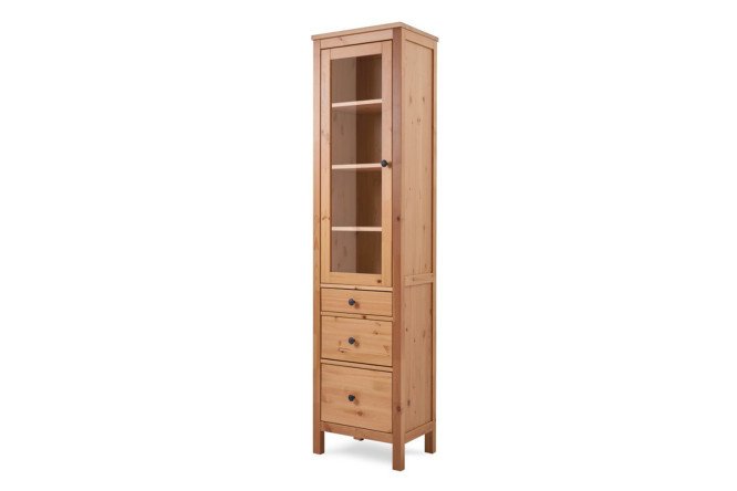 The Kymor display cabinet is made of solid pine, painted in light brown color while maintaining the visible structure of the wood. The back wall of the cabinet and the bottom of the drawers are made of laminated fiberboard. Door closers are installed on the doors. Care instructions: Wipe with a cloth dampened in a mild detergent, dry with a clean dry cloth.