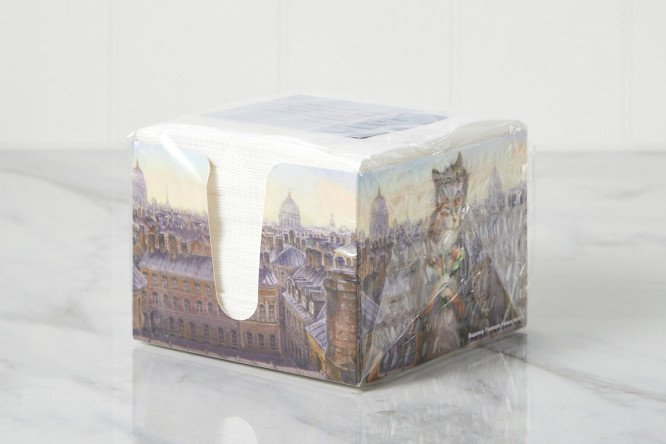 The napkins are packed in a spanner from which they are easy to take out and which will become a source of good mood, because it contains a reproduction of a painting by the famous artist Vladimir Rumyantsev with his beloved cats. The picture is imbued with kindness and humor; just one glance at it is enough for a smile to appear on your face and the day to sparkle with bright colors.