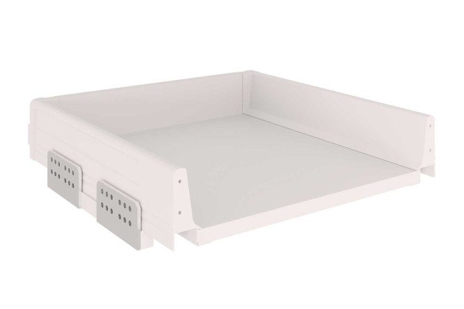 Low Start cabinet drawer made of laminated chipboard in white color.