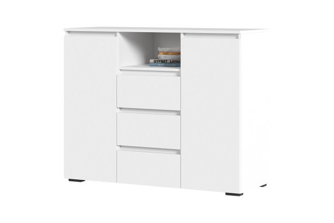 Helen’s chest of drawers with shelves behind hinged doors, drawers and an open niche will become a convenient storage system in the living room, bedroom or nursery. The cover can be used to install a TV, place a vase, lamp, indoor flowers or decorative items.