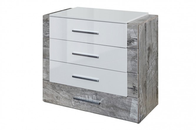 The Hudson chest of drawers in the Art Nouveau style is a practical and stylish piece of furniture that can decorate your interior. A chest of drawers with four spacious drawers will look impressive in the living room and bedroom; it will be appreciated by everyone who prefers a laconic and at the same time original style. The body and drawer fronts are decorated with an aged wood finish with an unusual print. The main background is effectively contrasted with monochromatic PSP overlays, which are characteristic of all cabinet furniture in the Hudson series.