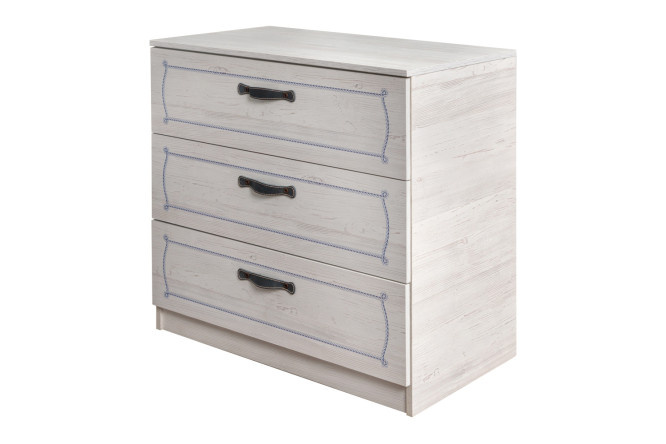 The chest of drawers from the Regatta children’s room furniture collection is made in the fashionable Nautical style. Convenient and functional, it does not take up much space and is perfect for storing small items, toys, clothes and linen. The model is made of high-quality laminated chipboard in Winterberg color, the ends are protected with impact-resistant ABS edges. The facades are decorated with a marine-themed design, applied using safe UV printing. The drawers are equipped with full extension ball guides with locks to prevent spontaneous opening and are complemented by original handles made of genuine leather.
