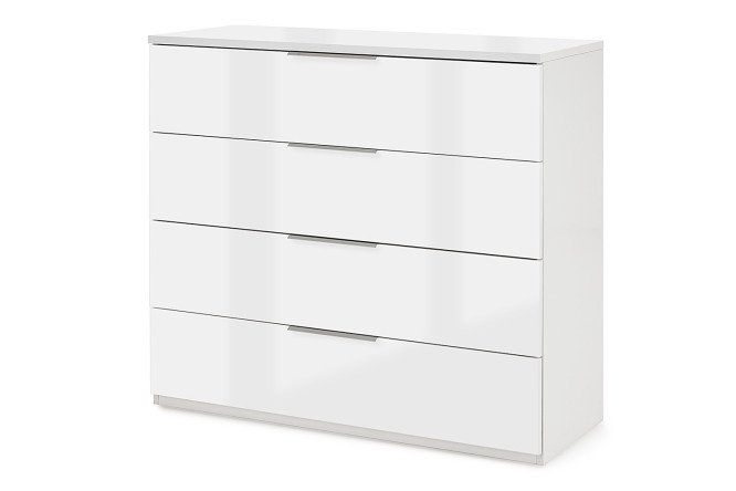 The Tyler chest of drawers is universal – you can use it to organize storage of things in the bedroom or living room. The drawers are convenient for storing textiles: clothes, bed linen, tablecloths, fabric napkins for table setting. Ball guides allow drawers to extend fully, making it easy to reach deep-stowed items. The laconic facades are made in a white finish and complemented with metal profile handles. The design solution is based on the idea of visually increasing space: reflections in glossy surfaces create volume and the illusion of an abundance of light.