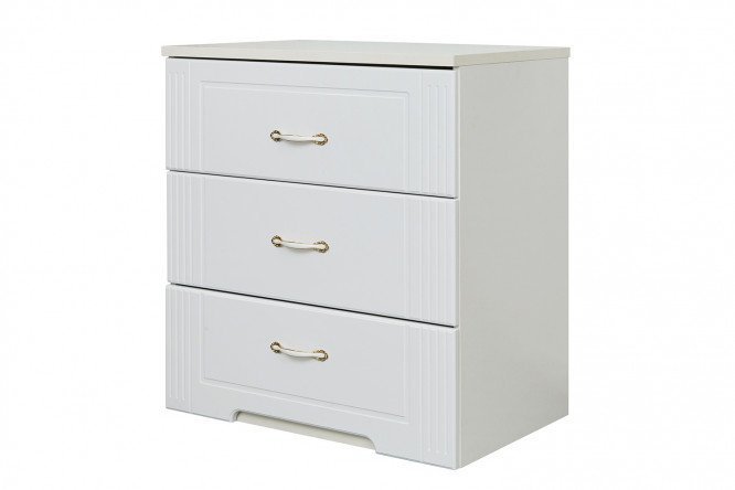 A comfortable low chest of drawers from the Victoria collection will perfectly complement the interior of a bedroom decorated in a classic style. Its body is made of high-quality, environmentally friendly 16/22 mm laminated chipboard in an elegant “white snow” decor. A distinctive feature of the model is the facades, decorated with milling, creating a single ornament. The material of manufacture is 16 mm thick MDF, lined with a glossy PVC film, which has dust- and dirt-repellent properties. The chest of drawers is equipped with three spacious drawers with full extension ball guides. Elegant handles with white overlays are painted in a noble color of aged gold.