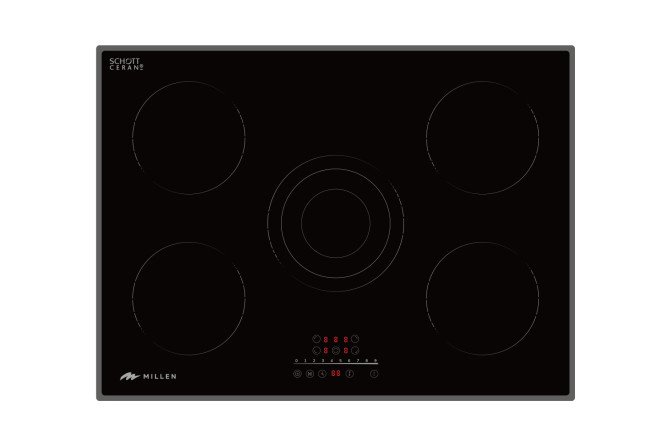 The MILLEN MEN 702 BL electric panel with five burners and a built-in timer is the most powerful in the brand’s line. Four burners are designed for dishes with a diameter of 16.5 cm, and the fifth is three-circuit, allowing you to change the heating zone depending on the size of the dishes.