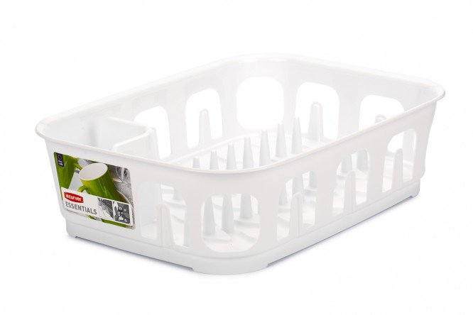 Essentials dish draining rack made of plastic material in white.