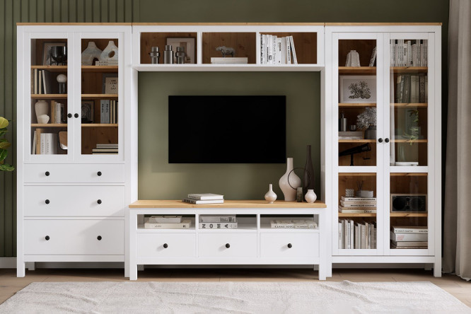 The Evans living room is made from solid pine and painted white while maintaining the visible wood grain. The legs are 11 cm high, making it easy to clean underneath. The drawers are on roller guides, but the inside is not painted white like the main part, which gives them a natural look. The display […]