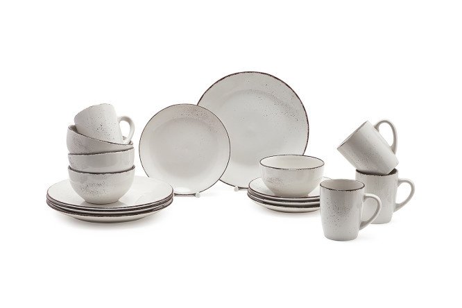 The EVIO Tika table set for 4 people will allow you to serve not only lunch or dinner, but also tea in the same style: it includes plates, salad bowls and mugs. The dishes are made of ceramics imitating natural stone and decorated with an unusual edging, as if applied with a careless artist’s brush. The service looks very modern and will decorate any table.