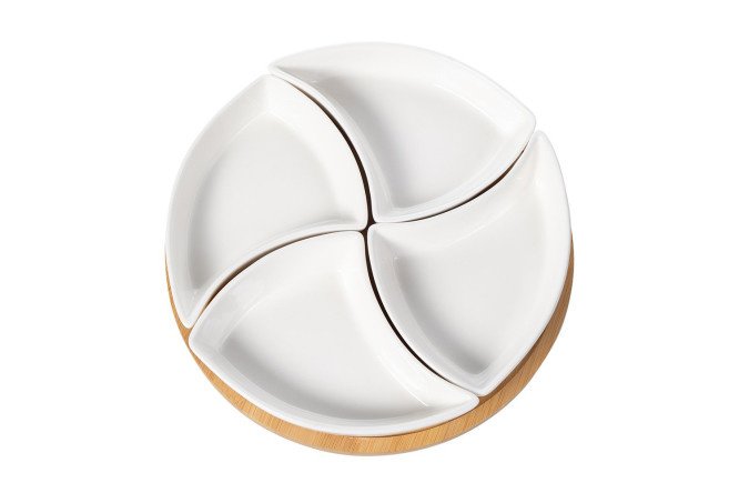 The elegant EVIO Wave table holder will decorate a table decorated in any style and color. The four gracefully curved bowls are made of snow-white porcelain, and the stand is made of golden bamboo. The materials are environmentally friendly and easy to care for. Glazed porcelain does not absorb odors and does not change the taste of the contents.