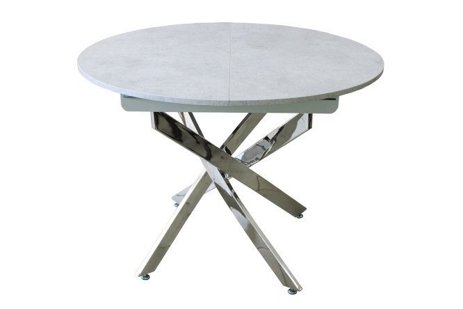 The compact Ontario table will not take up extra space, but will definitely attract attention with its original design. A special feature of the model is the crossed supports made of chromed metal, creating the feeling that the table is frozen in an energetic dance step. Visual contrast is created by using the texture of concrete and the glossy finish of the underframe. Thanks to the sliding mechanism, the round tabletop can easily be transformed into an oval one, increasing in length by 35 cm. Adjustable thrust bearings will help set the product in a stable position.