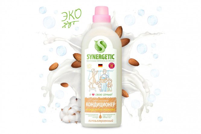 Synergetic fabric conditioner is designed for final care of all types of fabrics, suitable for linen, cotton, wool and synthetic products. The product gives linen unsurpassed softness and a subtle, unobtrusive aroma, making it easier to iron textiles after washing. The soft hypoallergenic formula makes it possible to use the conditioner for children’s clothes.