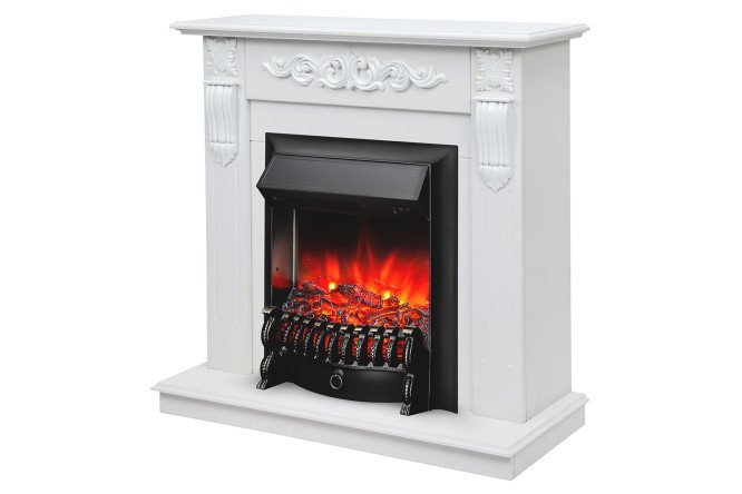 The white DOMINICA fireplace set is made in a warm wood tone with expressive textured veins. The restrained geometry of the frame is complemented by strict columns; the main decoration is the central volumetric decor in the form of an original floral ornament. The fireplace is safe and easy to use, equipped with a thermostat, all functions are regulated using the control panel. The hearth reproduces the picture of a real fire and creates the sound of cracking logs. Key Features: