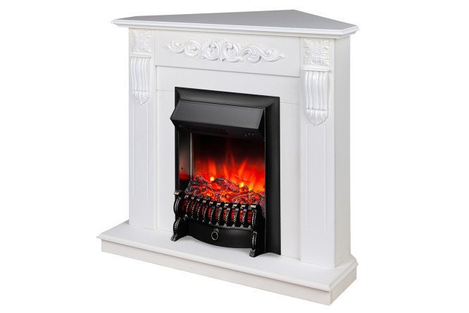 An elegant corner fireplace set is suitable for small spaces due to its compact size. The combination of white tone and discreet floral decor will make this fireplace an original continuation of the classic interior. A room with white furniture requires a minimum of additional accessories, because the clean and airy snow-white color itself creates a festive atmosphere. And if you want to decorate the space with additional attributes, then white color will be combined with almost anything. Key Features: