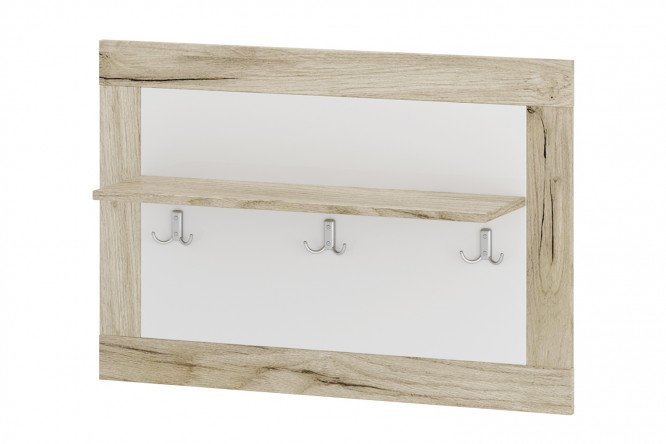 The Martin clothes hanger is a practical solution for storing jackets and coats in the hallway. It is optimal for an apartment or house where 1-3 people live. The product is based on a white glossy panel framed. Three metal hooks for clothes and a compact shelf for storing small items are attached to it. The panel is fixed to the wall using two metal hangers. The hanger belongs to the Martin collection and goes well with its other items.